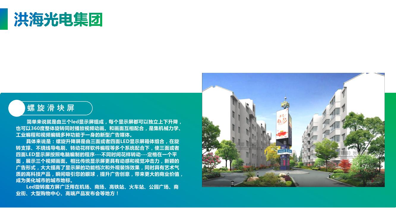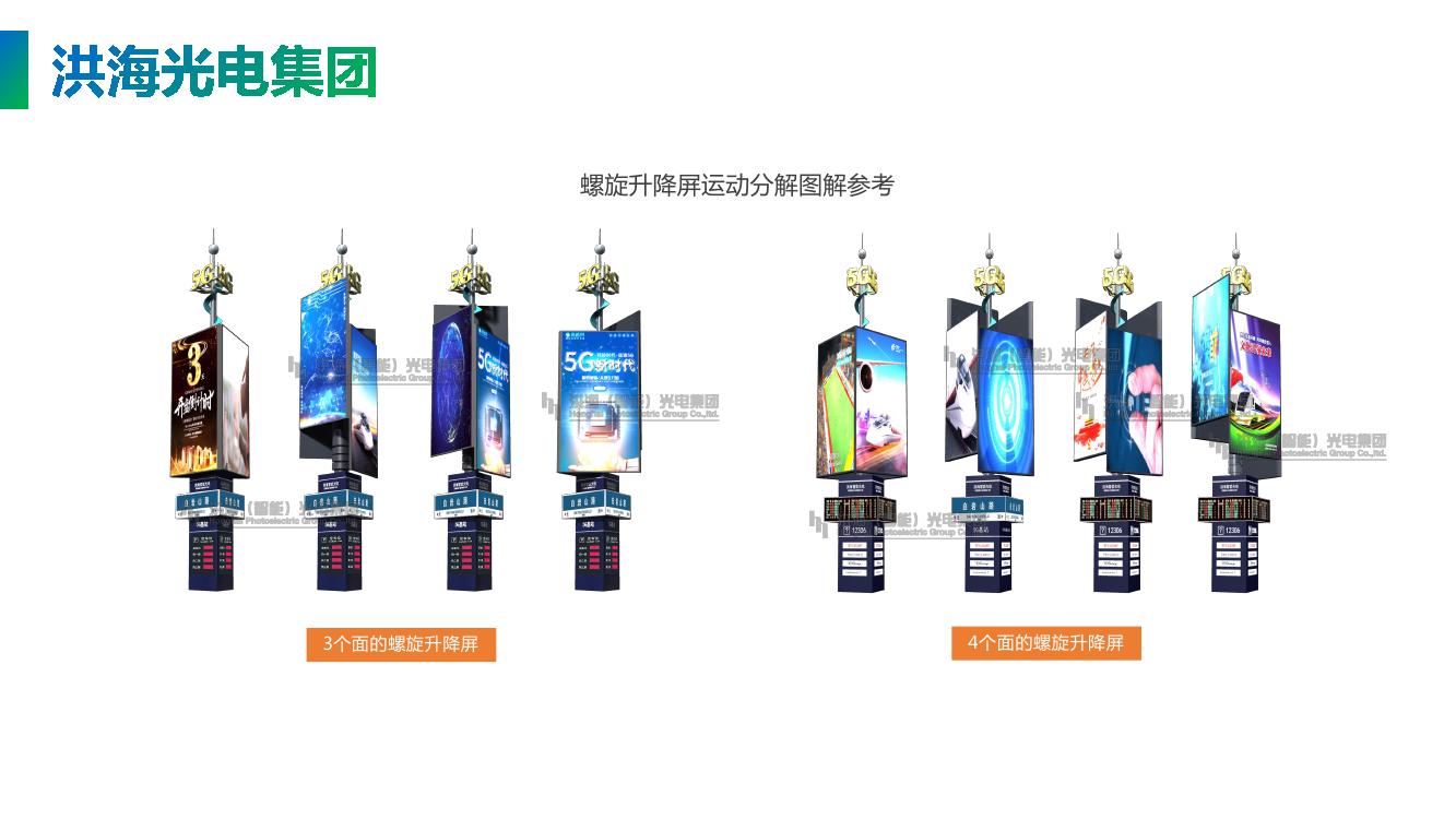 具體來說是:螺旋升降屏是由三面或者四面LED顯示屏箱體組合,在旋轉(zhuǎn)支撐、不繞線導(dǎo)電刷、轉(zhuǎn)動花樣軟件編程等多個系統(tǒng)配合下,使三面或者四面LED顯示屏按照電腦編制的程序---不同時間花樣轉(zhuǎn)動---定格在一個平面,展示三個視頻畫面。相比傳統(tǒng)顯示屏更具有動感和視覺沖擊力,新穎的廣告形式,大大提高了顯示屏的功能檔次和外觀裝飾效果,同時具有藝術(shù)氣質(zhì)的高科技產(chǎn)品,瞬間吸引您的眼球,提升廣告創(chuàng)意,帶來更大的商業(yè)價值,成為美化城市的城市地標(biāo)。Led旋轉(zhuǎn)魔方屏廣泛用在機場、商場、高鐵站、火車站、公園廣場、商業(yè)街、大型購物中心、高端產(chǎn)品發(fā)布會等地方。
